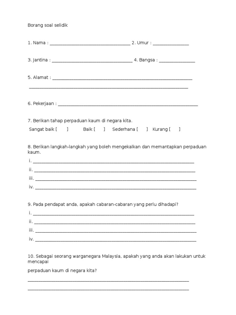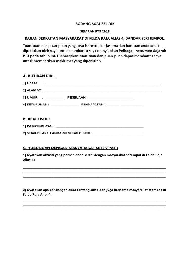 Borang soal selidik sejarah pt3 2018 kajian berkaitan masyarakat di felda raja alias 4 bandar seri jempol. Puan _____ binti _____ no. Borang temu bual Kerja lapangan tingkatan 1 2021 Sekolah Menengah Kebangsaan Taman Desa.
